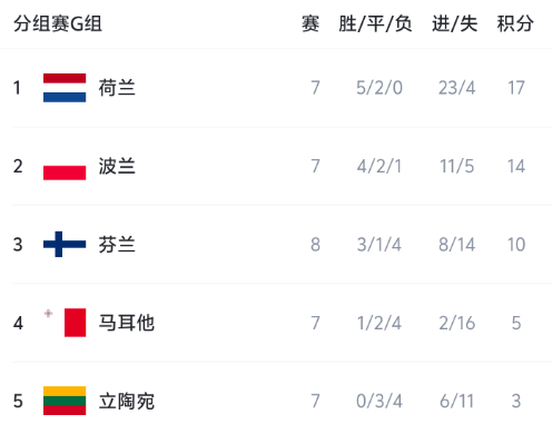這也意味著(zhù)除非末輪發(fā)生荷蘭主場(chǎng)輸給立陶宛+波蘭擊敗馬耳他且兩隊的比分之和抹消13個(gè)凈勝球差距的情況,否則荷蘭都將直接出線(xiàn),而波蘭將參加附加賽的爭奪。