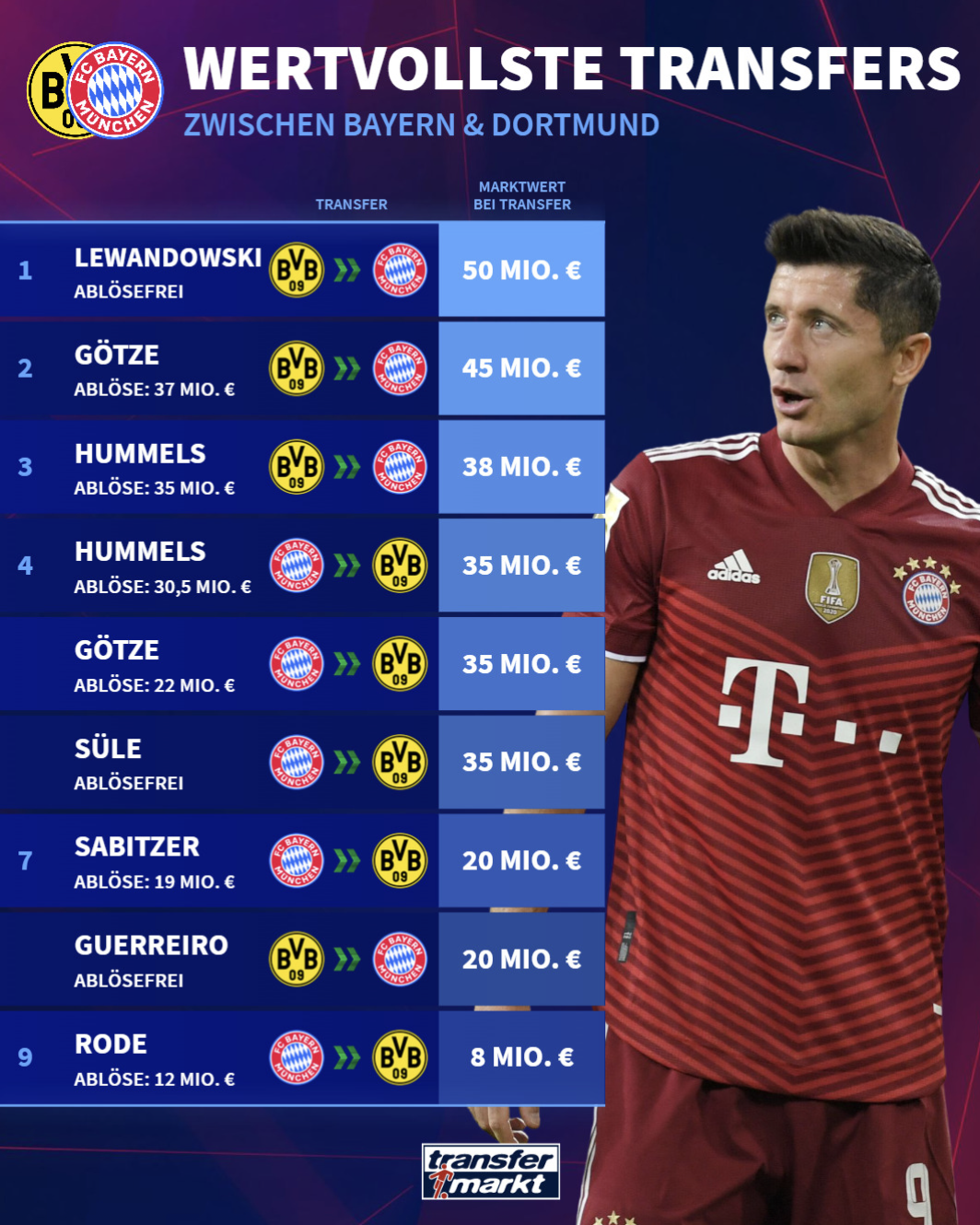 虎撲10月16日訊 德轉統計了拜仁和多特之間的轉會(huì ),并以轉會(huì )時(shí)的板拜身價(jià)高低列出了榜單。