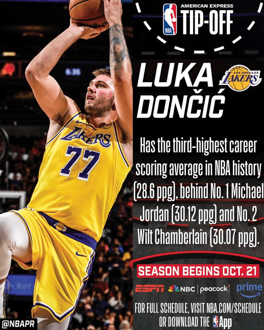 盧卡·東契奇以場(chǎng)均28.6分的場(chǎng)均生涯得分位列NBA歷史第三,僅次于排名第一的分位邁克爾-喬丹(場(chǎng)均30.12分)和排名第二的威爾特-張伯倫(場(chǎng)均30.07分)。