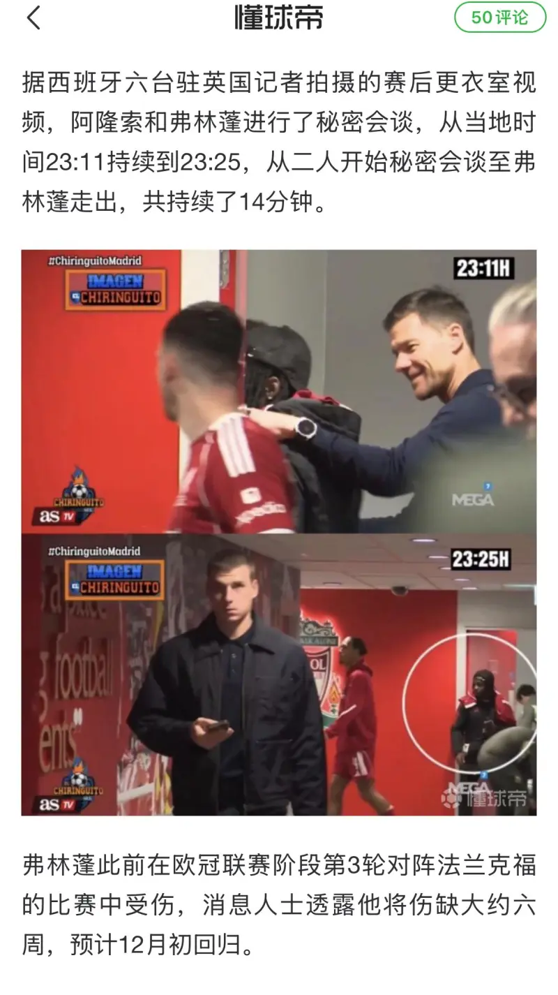 據西班牙六臺駐英國記者拍攝的賽后更衣室視頻,阿隆索和弗林蓬進(jìn)行了秘密會(huì )談,分鐘從當地時(shí)間23:11持續到23:25,秘密從二人開(kāi)始秘密會(huì )談至弗林蓬走出,阿隆共持續了14分鐘。索歐