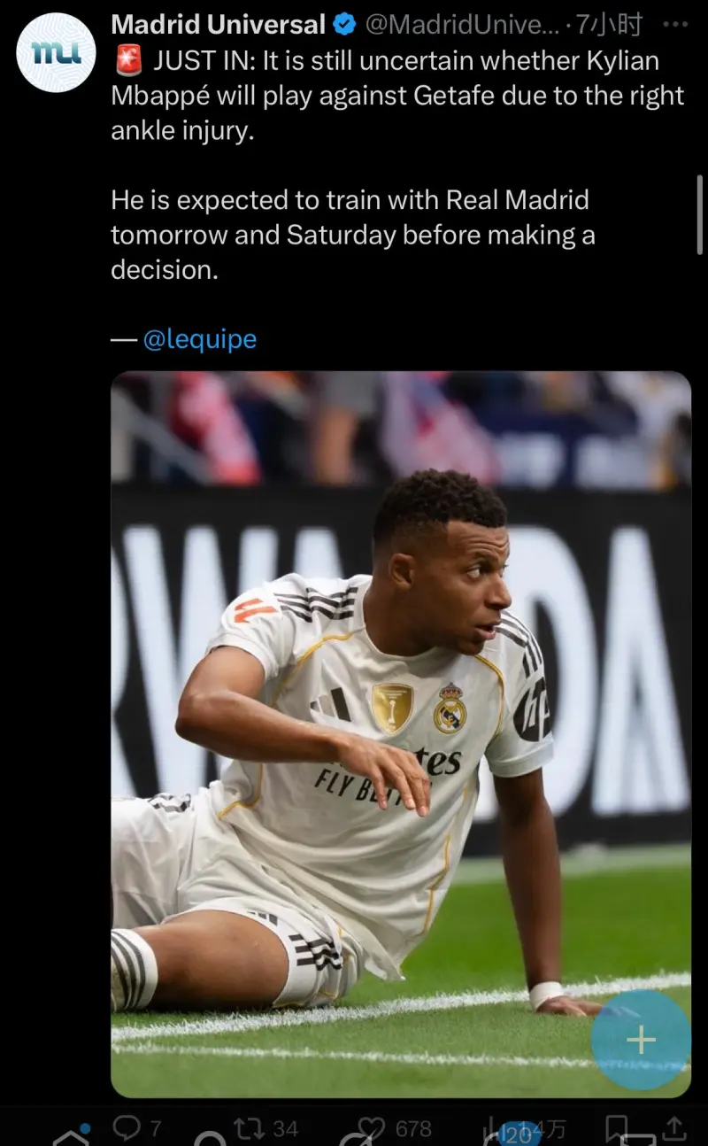 隊報:由于于右腳踝傷勢,皇馬球員姆巴佩能否出戰與赫塔菲的比賽仍不確定。他預計將在明天和周六隨皇家馬德里訓練后再做決定。