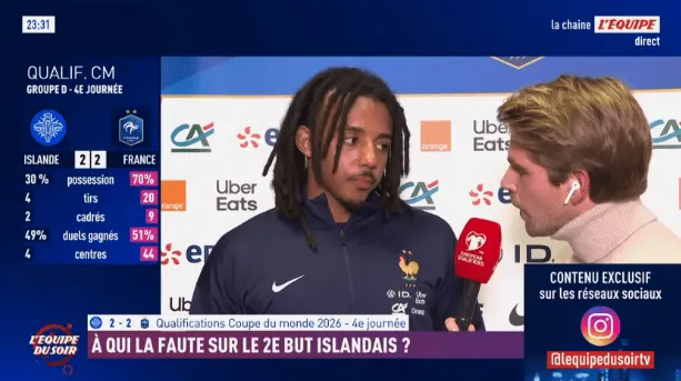 虎撲10月14日訊 法國國家隊中衛孔德在2-2戰平冰島的賽后,接受法國媒體隊報的球該混合采訪(fǎng)區瞬采。
