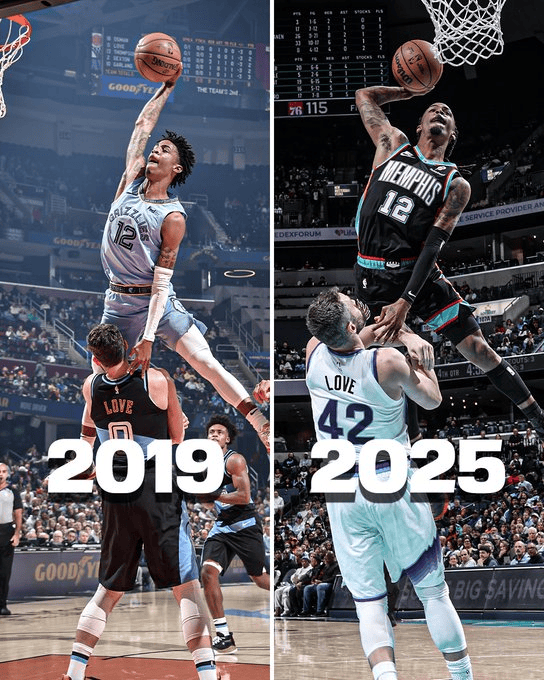 賽后,隔扣美媒NBA on ESPN曬出了19年和25年莫蘭特隔扣樂(lè )福的片對照片對比: