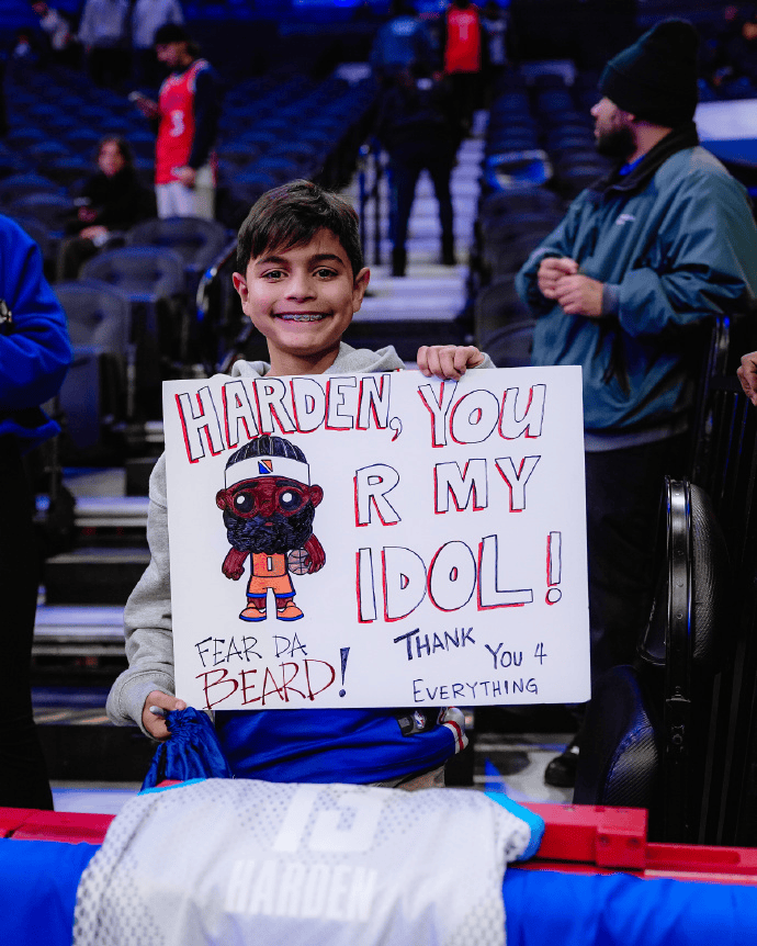 [流言板]76人主場(chǎng)小球迷舉標語(yǔ)現場(chǎng)支持:哈登你是我的偶像!