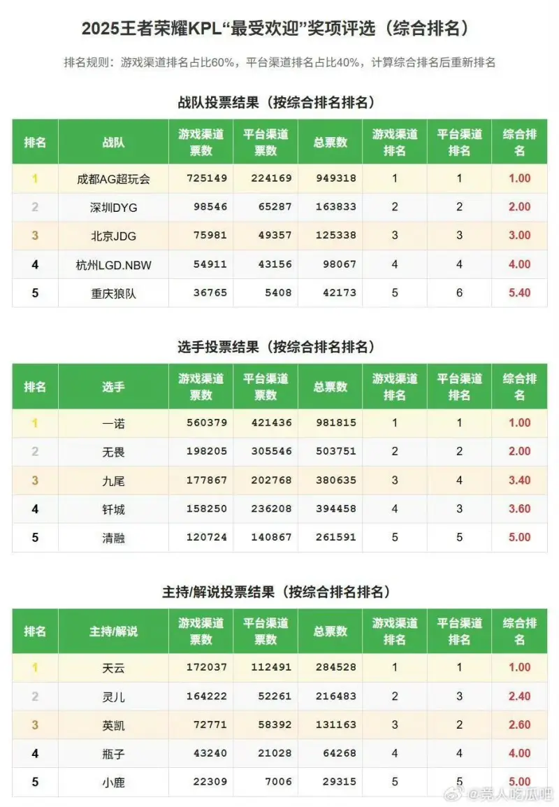 狼隊在“最受歡迎”獎項評選中位列第五,平臺渠道票數5408