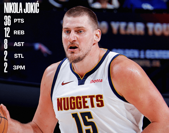 約基奇出戰三節,投籃16中14(87.5%),三分2中2砍下36分12籃板8助攻2搶斷。
