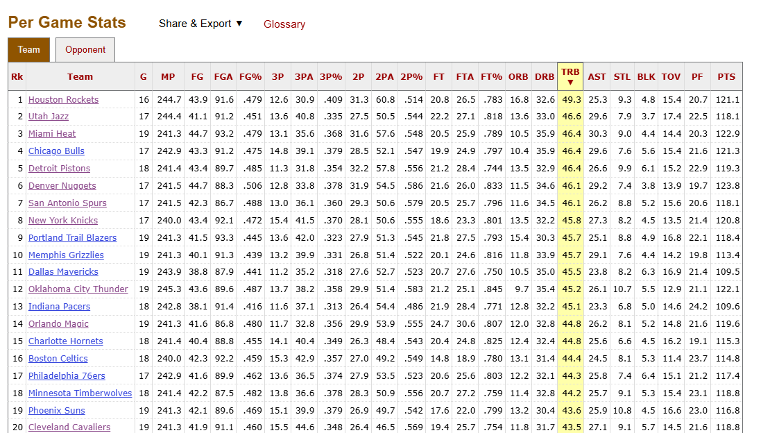 Basketball Reference最新的次名統計顯示,在球隊場(chǎng)均籃板數方面火箭以49.3個(gè)籃板高居聯(lián)盟第一,多達的差領(lǐng)先排名第二的于第爵士2.7個(gè)。