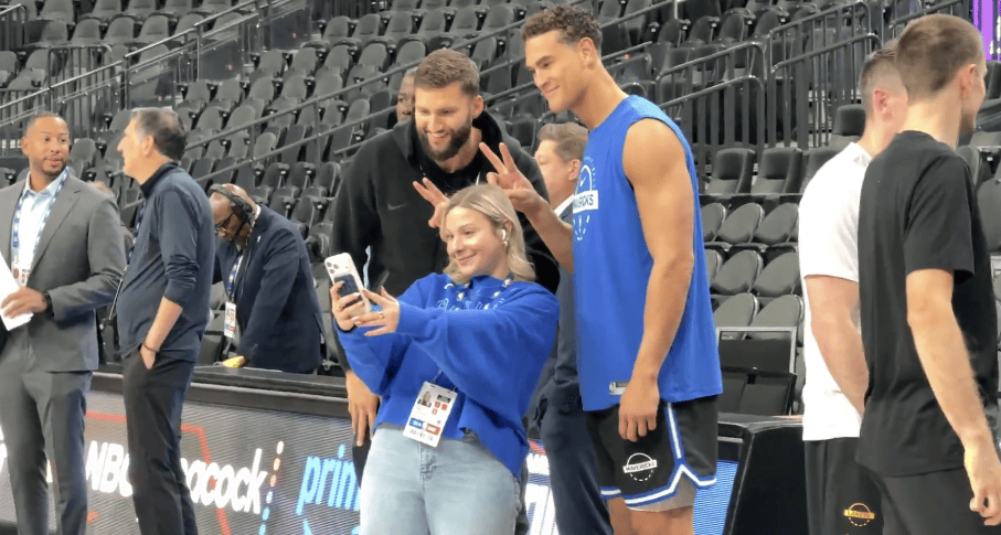 賽前獨行俠球員德懷特-鮑威爾和湖人球員馬克西-克勒貝爾在場(chǎng)邊合影和寒暄。寒暄