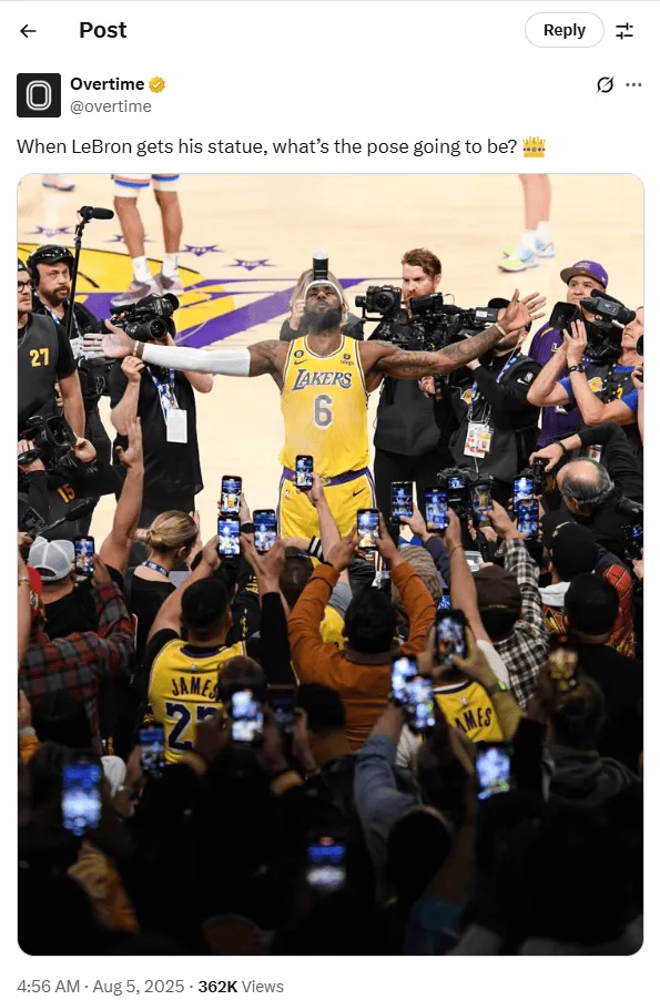 虎撲08月05日訊 今日,知名美媒Overtime發(fā)布討論話(huà)題:勒布朗的板O布朗雕像上會(huì )是他的哪個(gè)經(jīng)典姿勢?
