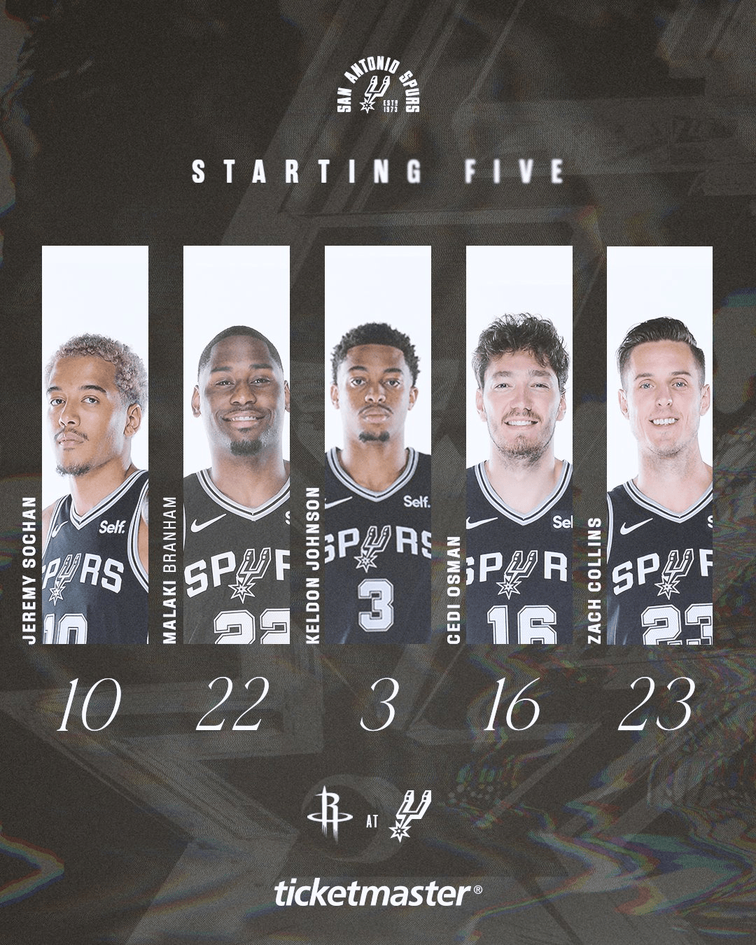 本場(chǎng)比賽馬刺首發(fā)為:索漢、板馬布蘭納姆、刺首約翰遜、奧斯曼、科林斯。