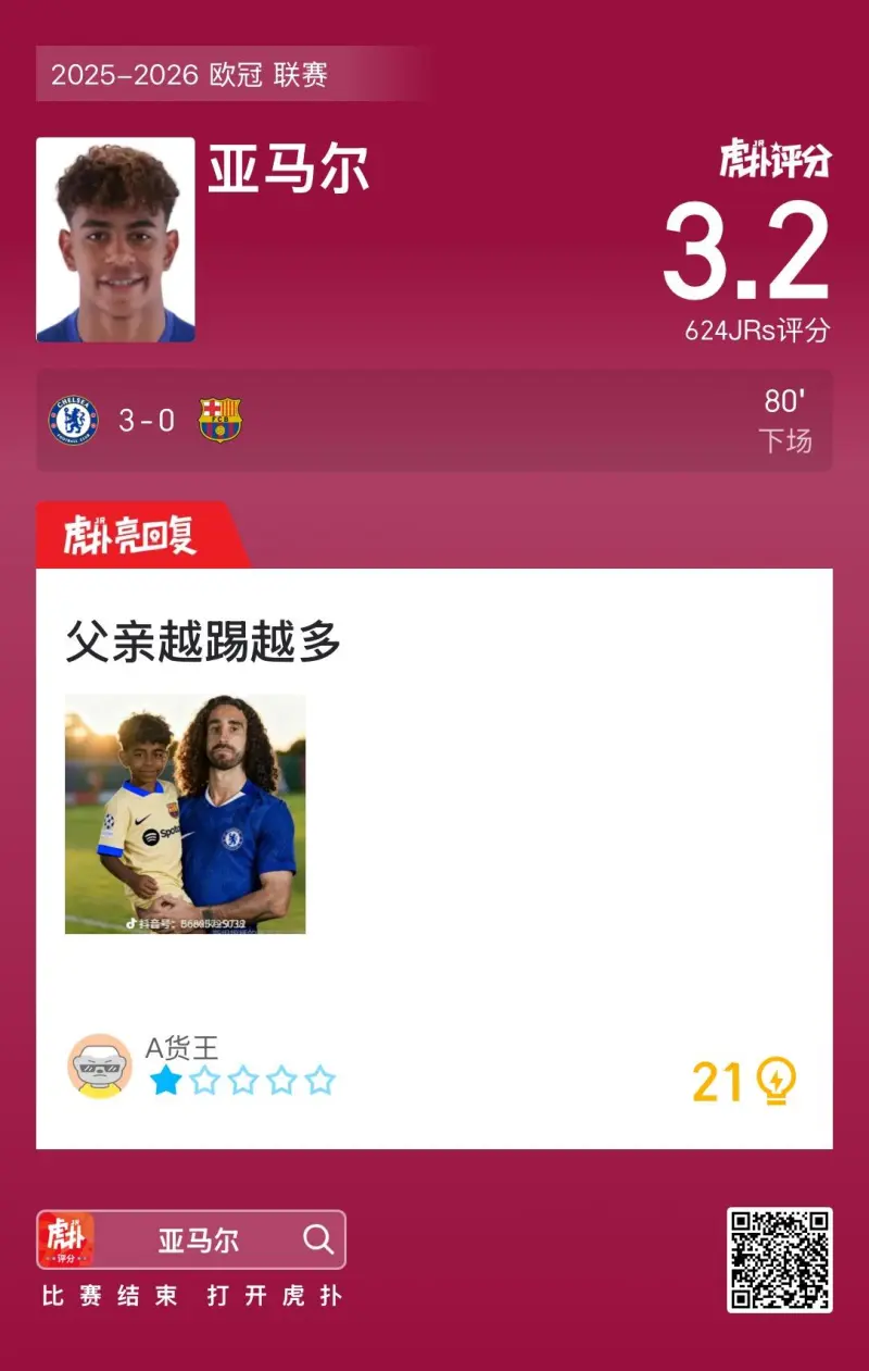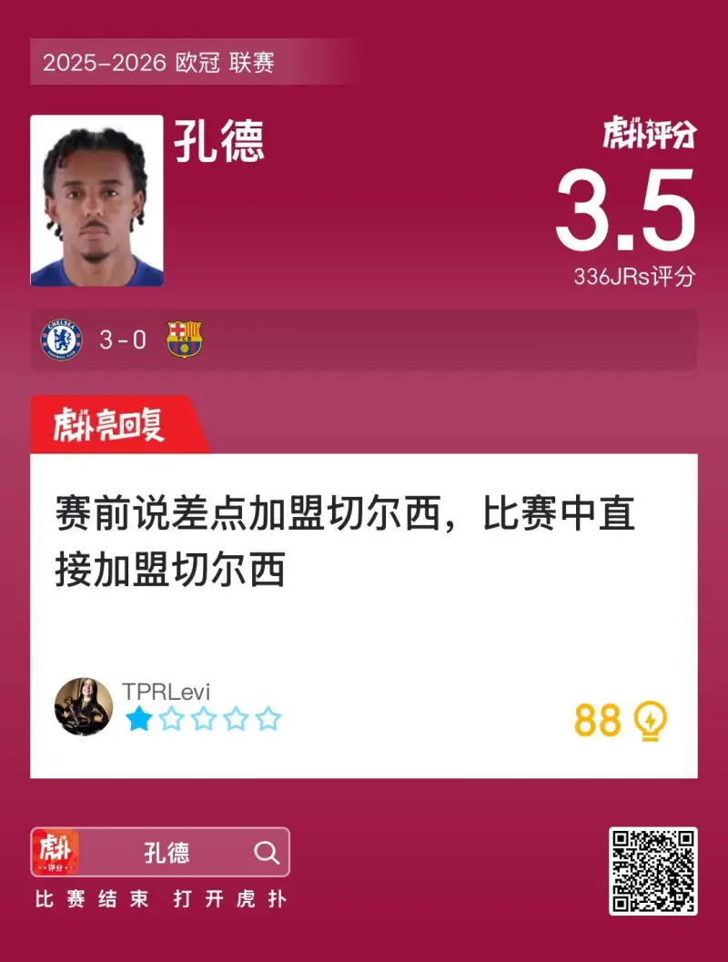 歐冠聯(lián)賽第5輪焦點(diǎn)大戰,切爾西主場(chǎng)3-0擊敗巴塞羅那。越踢越差越踢越多一起來(lái)看看JRs貢獻了哪些神評!父親