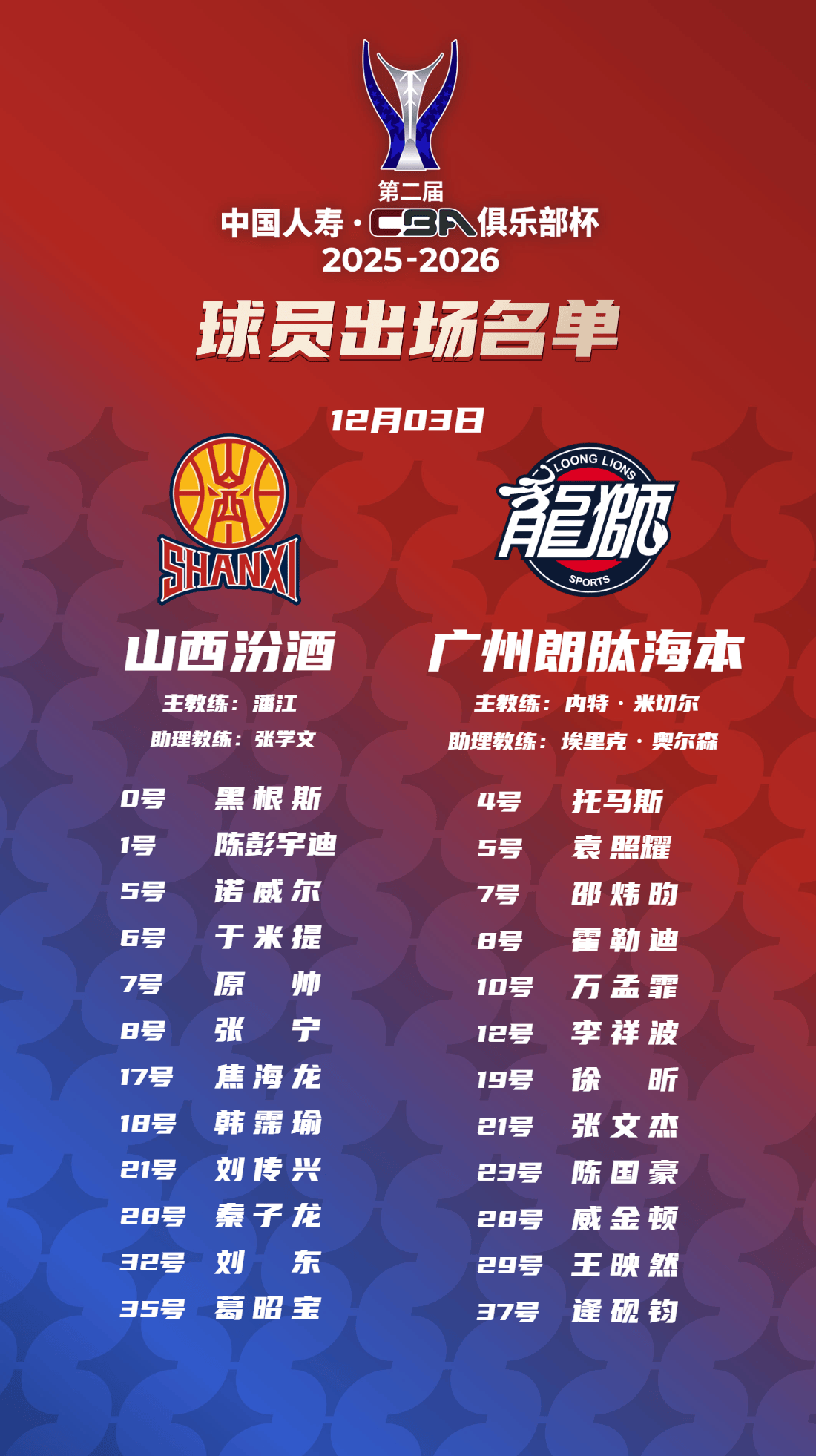 虎撲12月03日訊 今日CBA俱樂(lè )部杯,山西男籃將對陣廣州男籃。名單