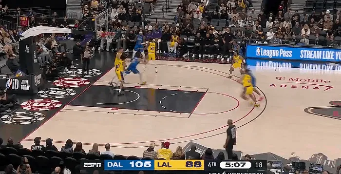 NBA季前賽,湖人對陣獨行俠的切接球雙比賽正在進(jìn)行中。