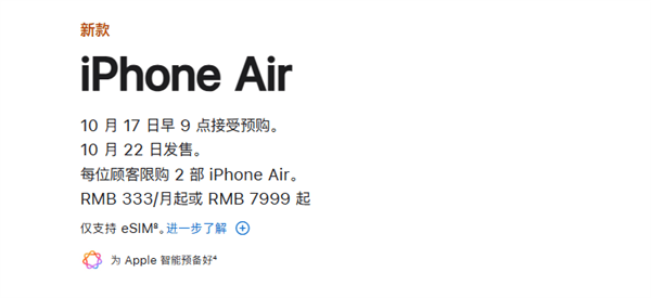 原本iPhone Air可以與其他機型同步開(kāi)售,當時(shí)官網(wǎng)顯示支持中國聯(lián)通eSIM,之后蘋(píng)果火速修改為發(fā)售日期待定,并且加入了中國移動(dòng)和中國電信的支持。