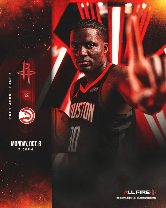 賽前,箭官季前火箭官方曬出卡佩拉的卡佩單人海報,預熱對陣老鷹的人海熱對季前賽。