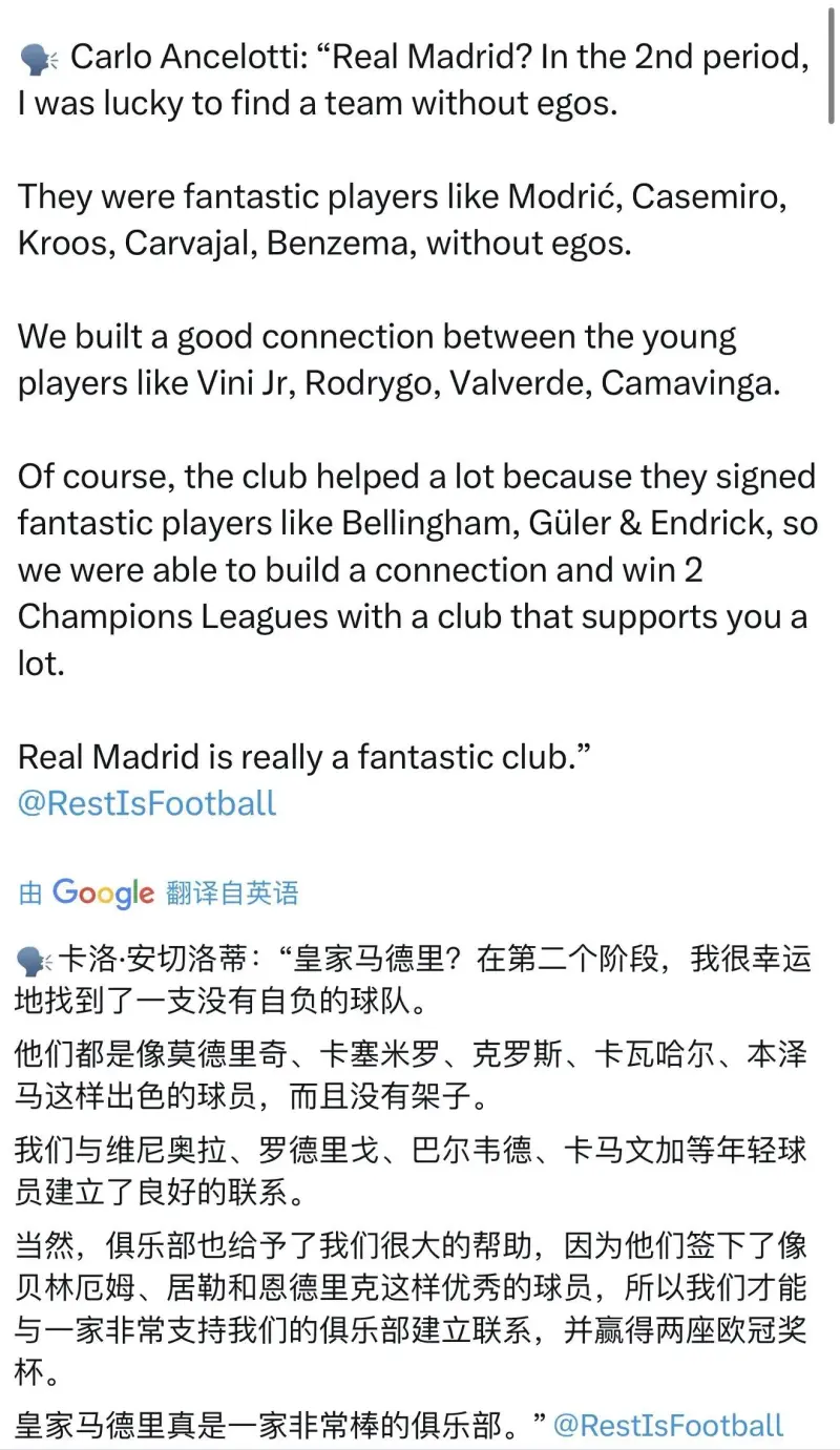 說(shuō)這批球員上賽季沒(méi)有為安切洛迪拼命的,去年歐冠岌岌可危的地找到支的球隊時(shí)候是誰(shuí)提前縮短傷病時(shí)間回來(lái)救駕?是修斯、是自負羅德里戈、是安切貝林厄姆,是米利唐。打亞特蘭大,修斯提前復出體能跟不上,選擇回后場(chǎng)出球送貝林厄姆上去這么經(jīng)典的比賽這就忘了?指望他們場(chǎng)場(chǎng)這么干?救急不救貧。想讓這些球員s就直說(shuō),哪找那么多冠冕堂皇的借口。