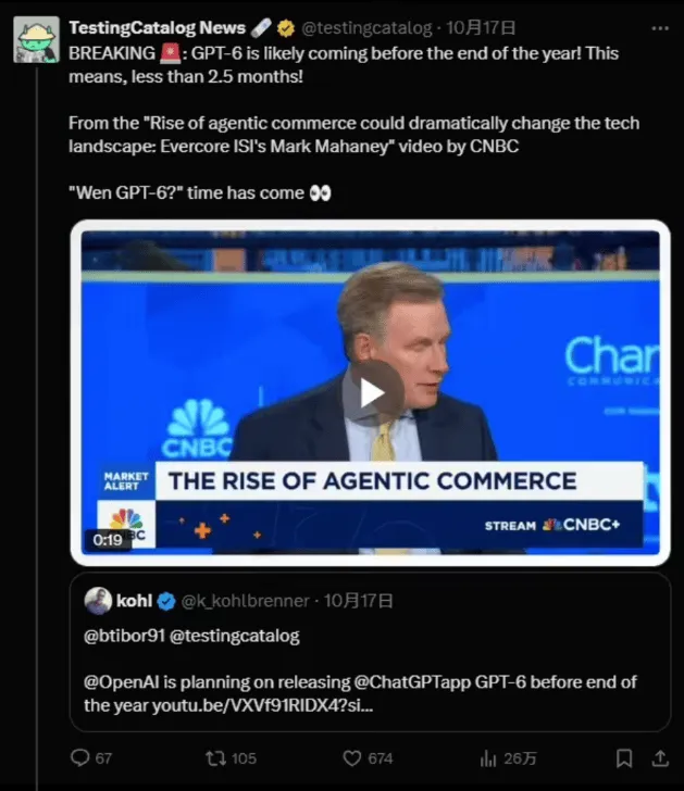 自發(fā)布以來(lái),OpenAI 已對 GPT-5 進(jìn)行了多次更新。那么 GPT-6 呢?它是否會(huì )很快到來(lái)?本周,在接受 CNBC 采訪(fǎng)時(shí),Evercore ISI 分析師 Mark Mahaney 表示,GPT-6 預計將在今年年底前推出,并帶來(lái)顯著(zhù)的性能提升。