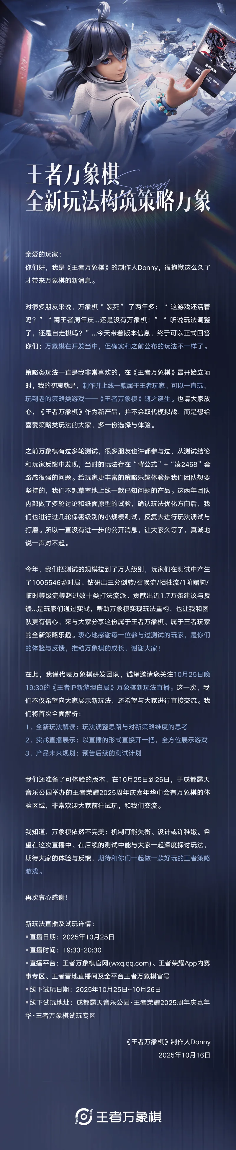 我謹代表萬(wàn)象棋研發(fā)團隊,玩直玩誠摯邀請您關(guān)注10月25日晚19:30的《王者IP新游坦白局》萬(wàn)象棋新玩法直播。期待跟大家一起做一款好玩的王者策略游戲。
