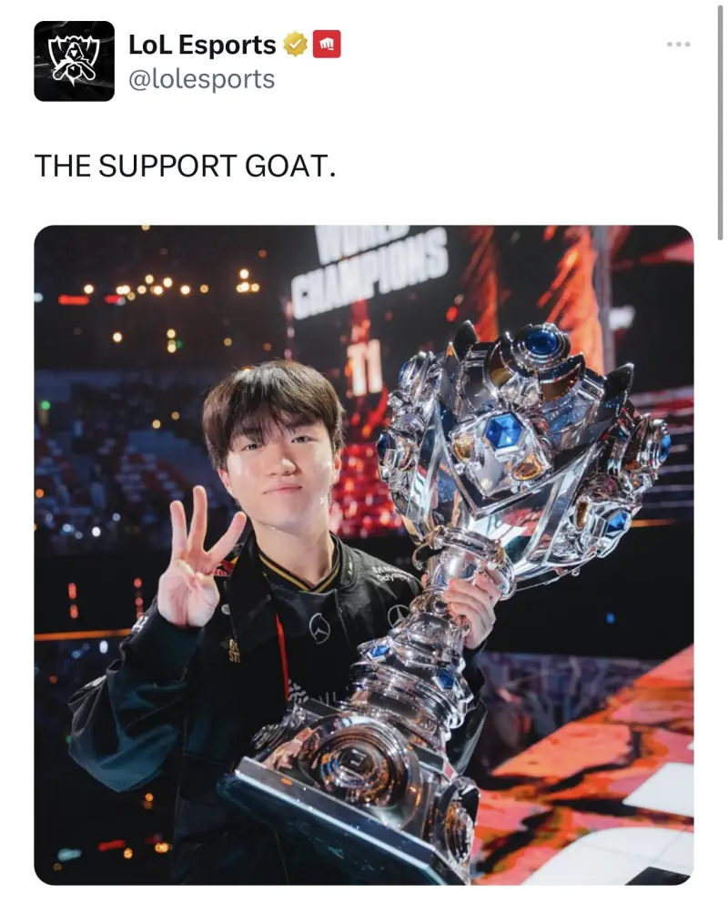 [流言板]三冠加身!LOL官推曬Keria捧杯照并配文:輔助位的GOAT