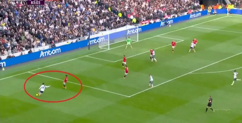 但還是那句話(huà),曼聯(lián)在這一點(diǎn)上是不能指望的,所以關(guān)鍵在于其他環(huán)節。雖然曼聯(lián)在進(jìn)攻端的布置在理論上稍有問(wèn)題,庫尼亞和阿瑪德-迪亞洛在各自位置上的表現不足很清晰,導致上半場(chǎng)的反制能力沒(méi)能拔到理論上的最高值,但曼聯(lián)還是先進(jìn)一球,而且線(xiàn)路上恰好是右路的阿瑪德-迪亞洛傳給左路的姆貝烏莫: