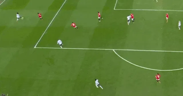 在回撤的時(shí)候選擇一腳出球,這當然是作為中鋒的支點(diǎn)能力的一個(gè)技能,但一腳出球的不足也很清晰,那就是你能一腳出球,說(shuō)明對手的前頂并沒(méi)有跟上,所以對手的防守注意力并沒(méi)有集中在中鋒的身上,對手的陣線(xiàn)也不會(huì )因此發(fā)生收縮和變形。這樣一來(lái),隊友的處理球環(huán)境并不會(huì )發(fā)生改善。所以,中鋒的支點(diǎn)能力遠沒(méi)有這么狹隘,因為最重要的一個(gè)點(diǎn)并沒(méi)有出現,那就是中鋒的背身能力往往是反制階段的節奏變化點(diǎn),進(jìn)攻節奏在這里變慢,然后轉移到其他地方再加快,這才是絕大部分反制的常態(tài)。很多朋友想象中的,反擊從前到后都是一腳出球,砰砰砰地打到對方門(mén)前,那只會(huì )經(jīng)常發(fā)生在足球游戲當中。更何況,我們看的是2025年的曼聯(lián),而不是2011年的皇馬。