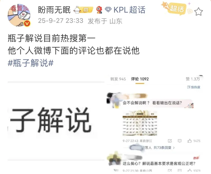 [JR熱議]“瓶子解說(shuō)”登上熱搜第一,瓶子解說(shuō)個(gè)人WB評論區已被攻陷,熱議熱搜人