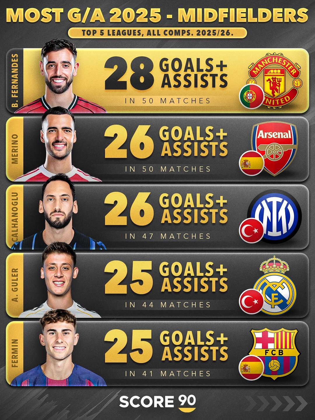 虎撲11月10日訊 Score 90統計了2025年在各項賽事(包括俱樂(lè )部和國家隊)中參與進(jìn)球最多的五大聯(lián)賽中場(chǎng)球員: