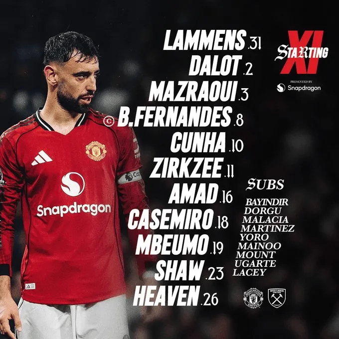 虎撲12月04日訊 英超第14輪,曼聯(lián)主場(chǎng)對陣西漢姆聯(lián)。賽前,雙方公布首發(fā)陣容: