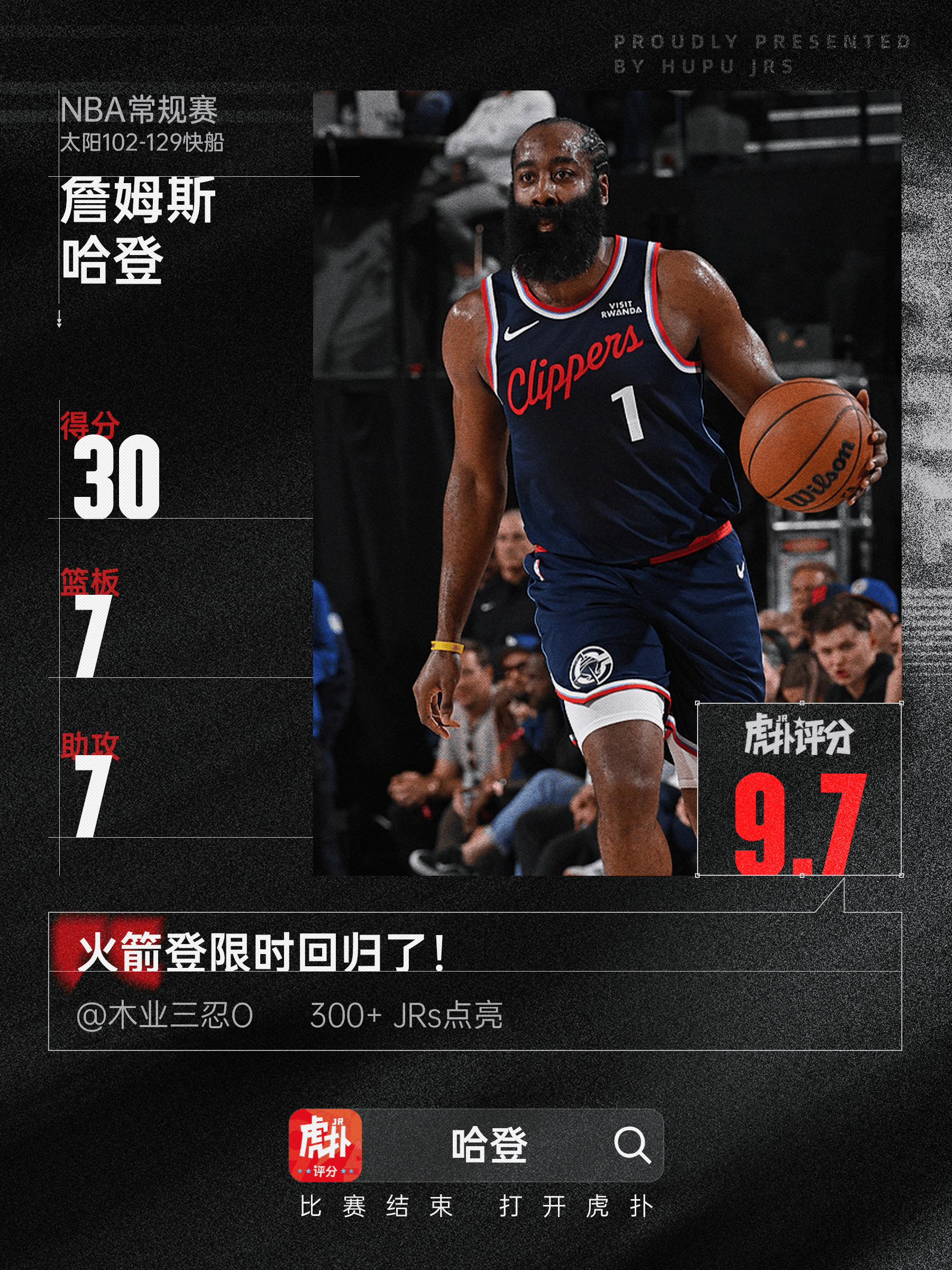 全場(chǎng)比賽,戰分鐘中助帽哈登出戰28分鐘,分中分板12中8,板哈三分7中5得到30分7板7助攻1蓋帽。登全
