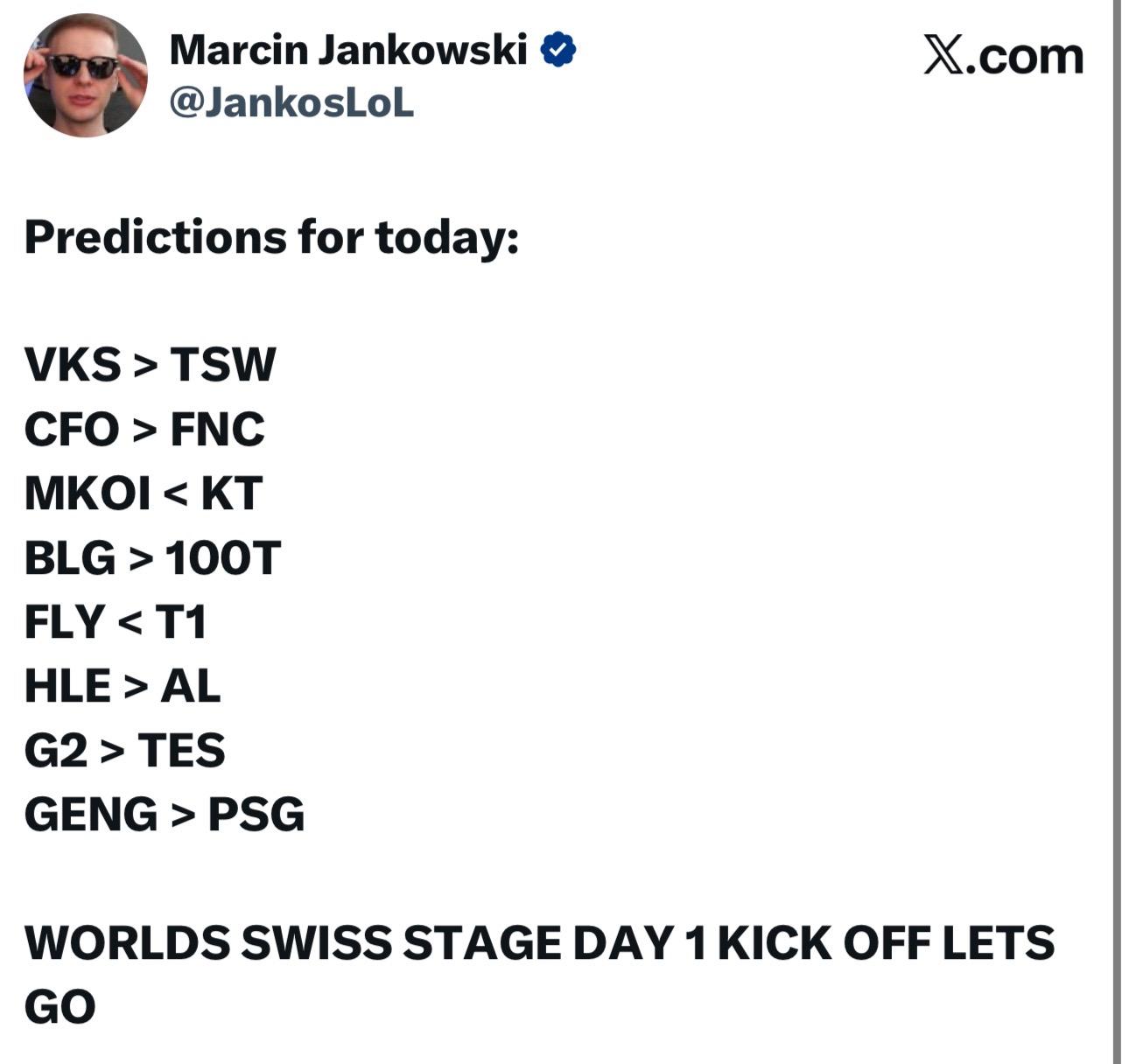 [流言板]Jankos預測瑞士輪首輪:HLE戰勝AL、測瑞BLG戰勝100T、士輪首輪勝G2戰勝TES由虎撲游戲電競資訊 發(fā)表在英雄聯(lián)盟 https://bbs.hupu.com/lol