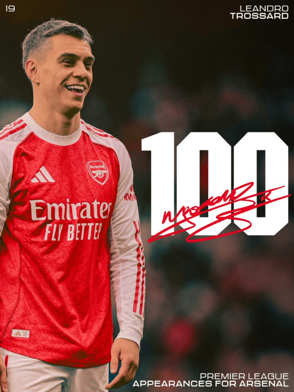 [流言板]特羅薩德代表阿森納出戰100場(chǎng)英超,俱樂(lè )部官方發(fā)布紀念海報