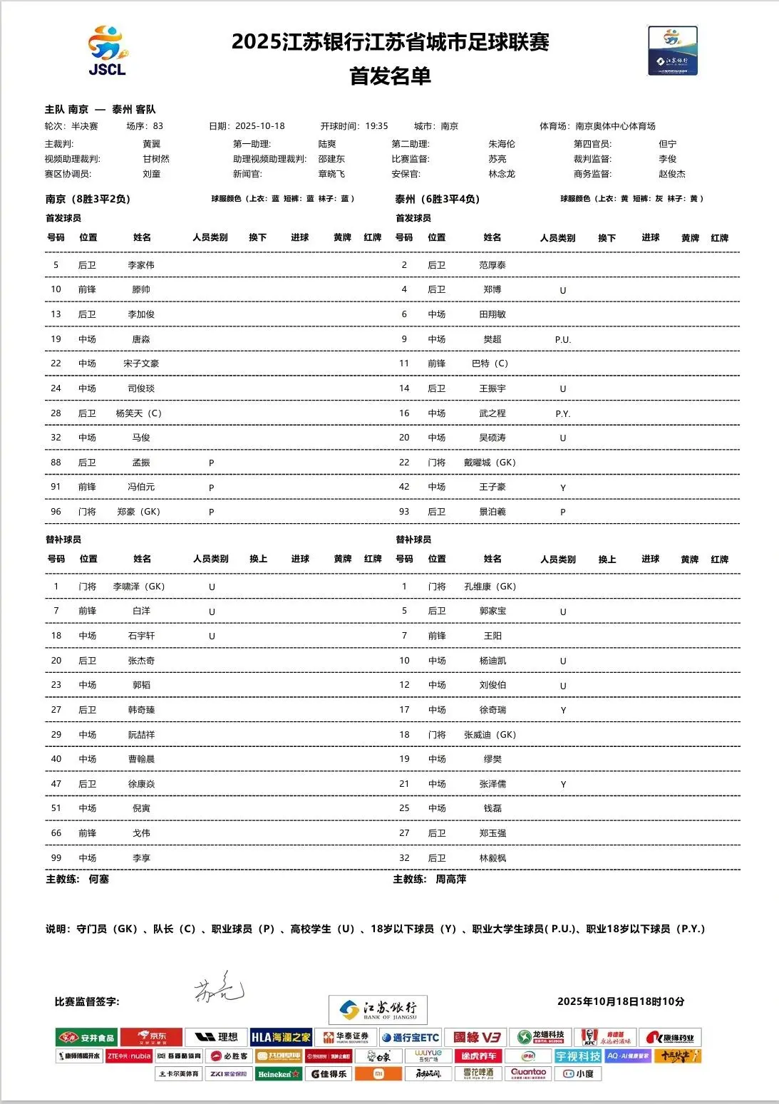 來(lái)源:微博虎撲10月18日訊 今晚蘇超半決賽首場(chǎng)對決一觸即發(fā),南京將在主場(chǎng)迎戰泰州。賽前,首發(fā)名單已經(jīng)出爐。