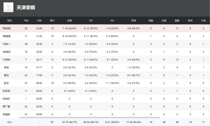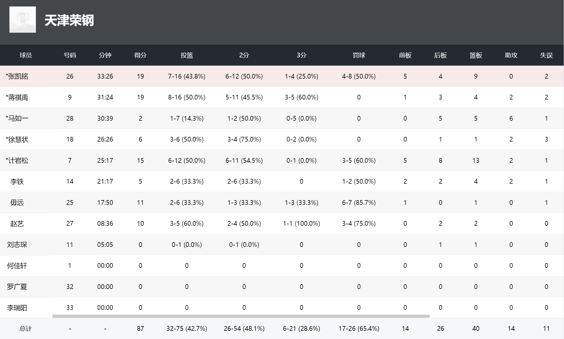 天津U21:張凱銘19分9板,助北蔣祺禹19分4板2助,流言力克計巖松15分13板2助。板全