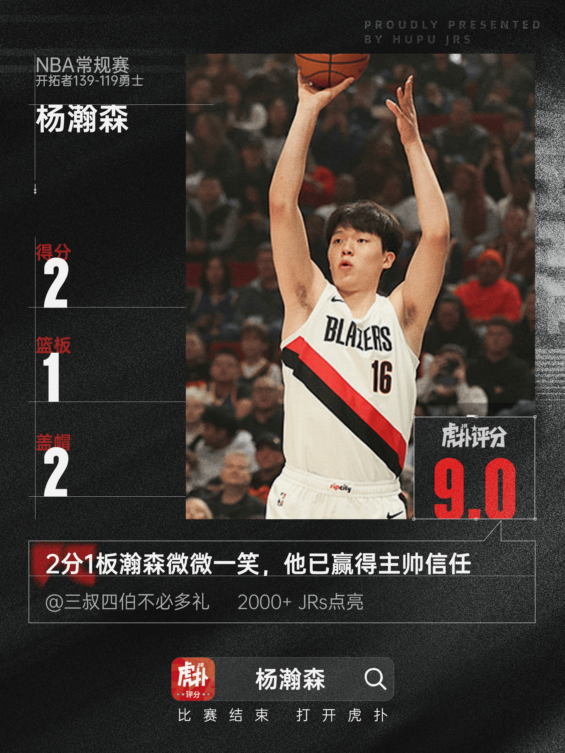 開(kāi)拓者球員楊瀚森出戰7分14秒,蓋帽投籃3中1得到2分1籃板2蓋帽。流言籃板
