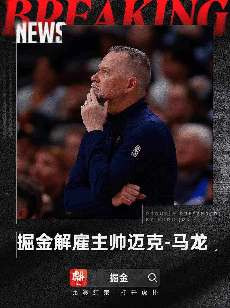 虎撲04月09日訊 根據Shams Charania的報道,掘金已經(jīng)解雇主帥邁克爾-馬龍。邁克