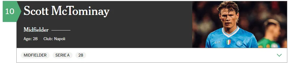 意甲記者James Horncastle透露,從曼聯(lián)加盟那不勒斯后的第一個(gè)賽季,麥克托米奈表現驚艷,幫助球隊贏(yíng)得意甲冠軍,榮膺聯(lián)賽最有價(jià)值球員,并獲得金球獎提名。
