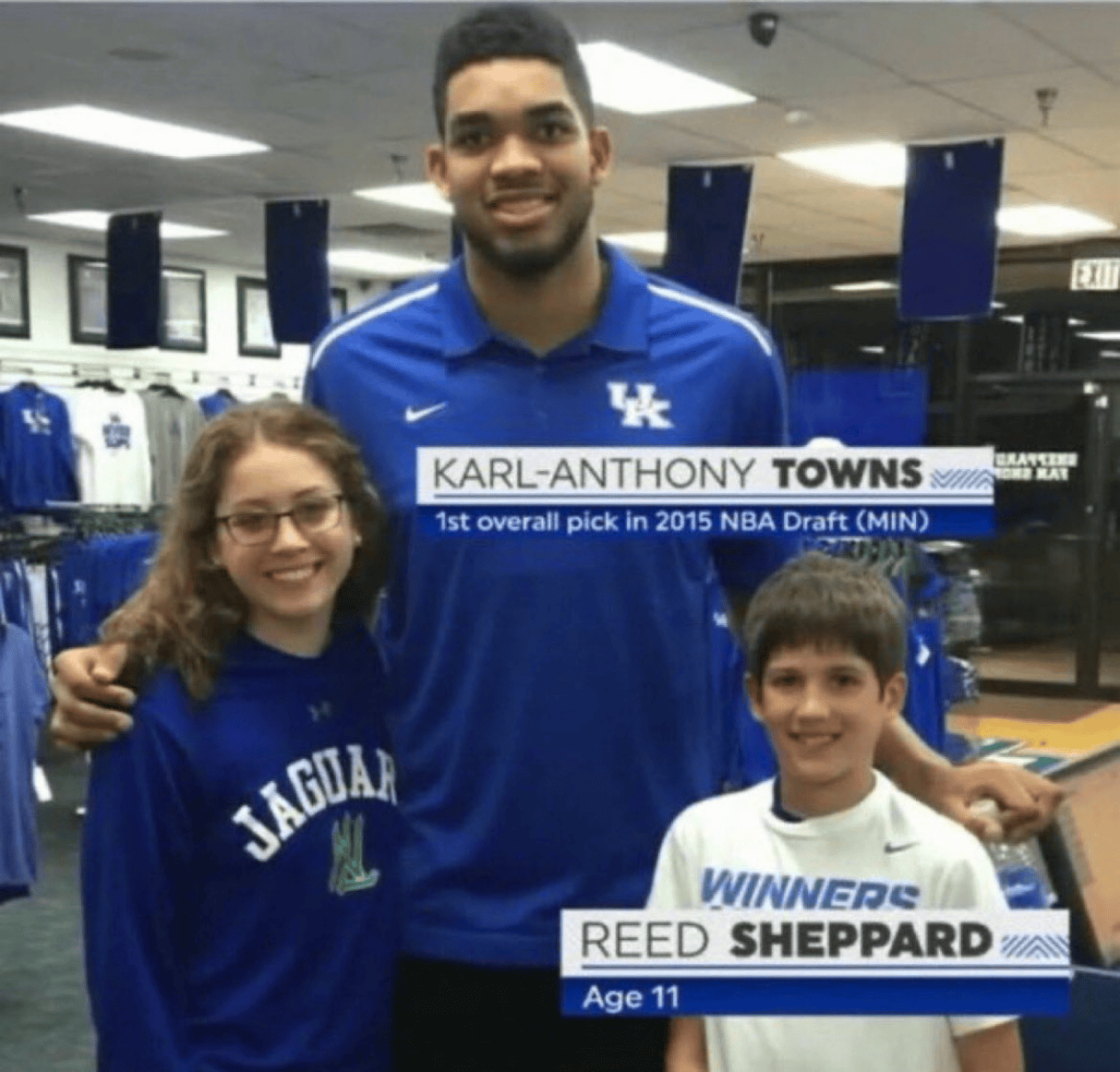 該照片拍攝時(shí)卡爾-安東尼-唐斯還在效力于肯塔基大學(xué),年幼謝潑德的謝潑父母也都是前肯塔基大學(xué)籃球運動(dòng)員。