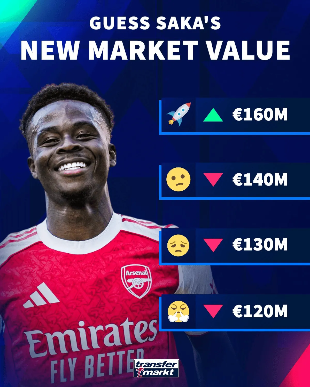 薩卡目前德轉身價(jià)為1.5億,他的身價(jià)最高可能漲至1.6億,而最低可能跌至1.2億歐。